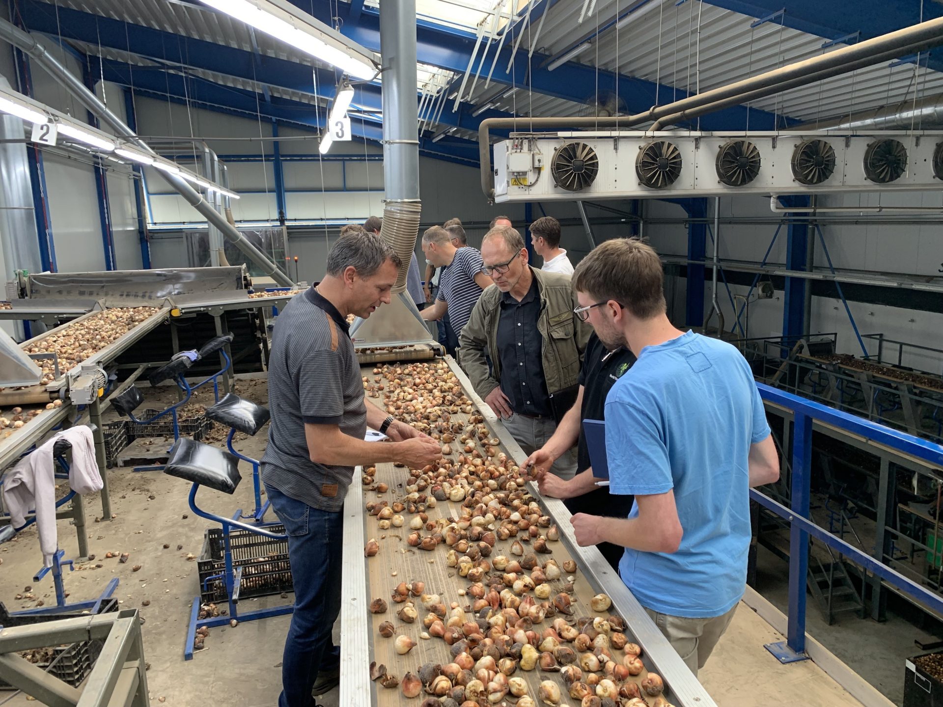 Deelnemers aan de informatiebijeenkomst betreffende een nieuwe generatie pelmachine brengen een bezoek aan Horizon Flowers om het pelproces te bekijken.